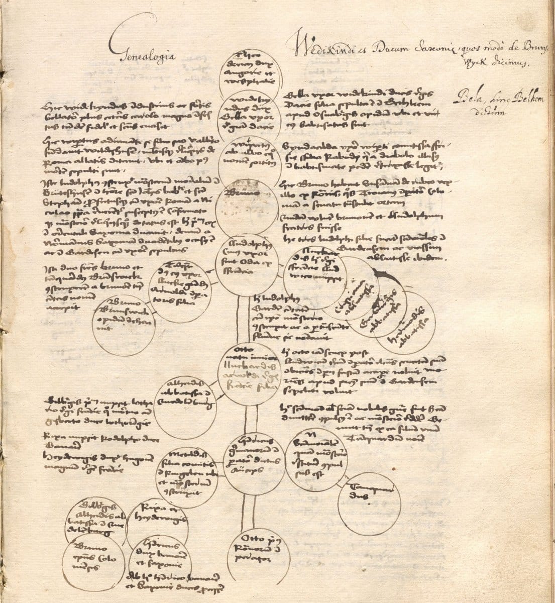 - Innerhalb des Textes der Westfalengeschichte sowie am Ende der Handschrift finden sich eine Reihe von Stammbäumen, die nicht vollständig in den Druck übernommen wurden. Eine genaue Analyse des Inhalts dieser schematischen Darstellungen steht bislang noch aus. Foto: Museum Abtei Liesborn des Kreises Warendorf