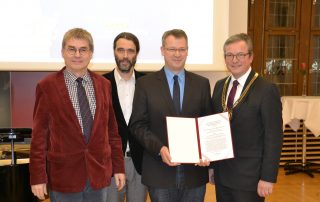 Bildzeile: Der Altertumsverein Paderborn hat den Meyer-Preis an Dr. Martin Dröge (zweiter von rechts) verliehen. Ihm gratulierten (von links) Laudator Prof. Dr. Dietmar Klenke, der Direktor des Altertumsvereins,Dr. Andreas Neuwöhner, und Bürgermeister Michael Dreier. [...]
